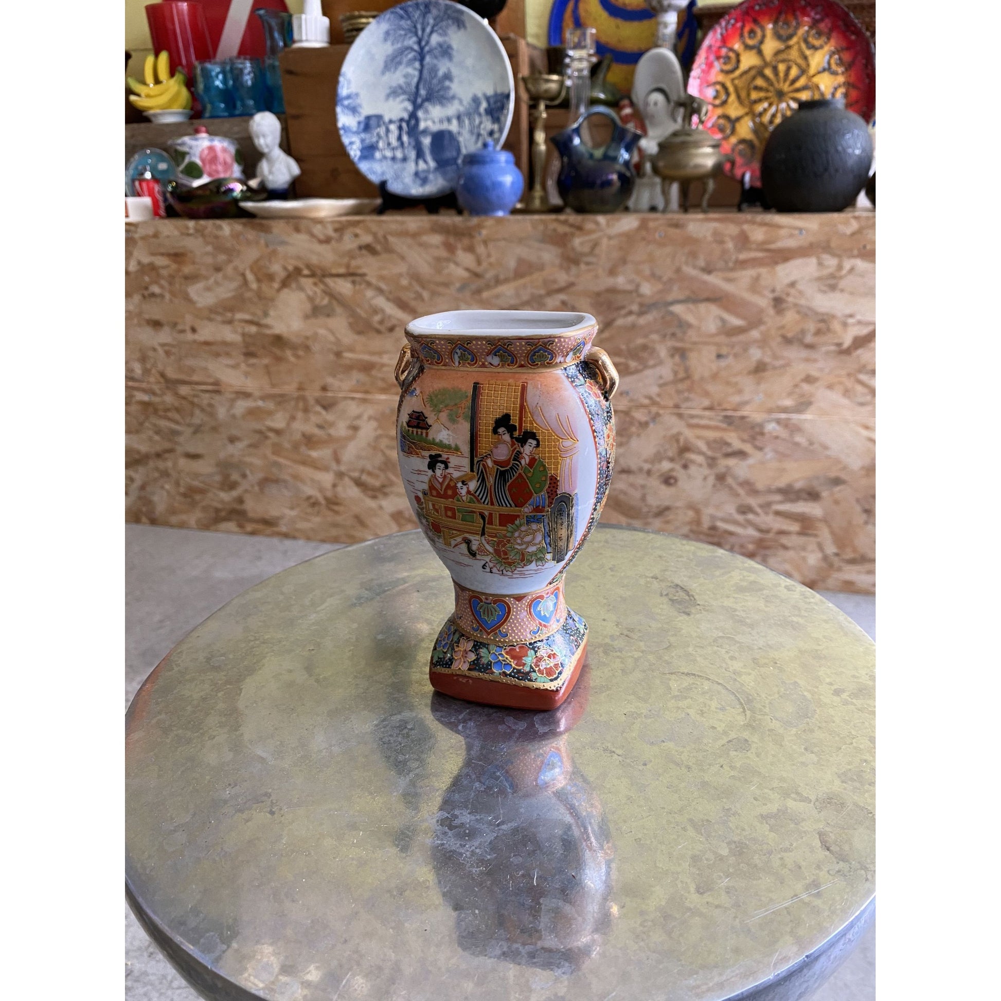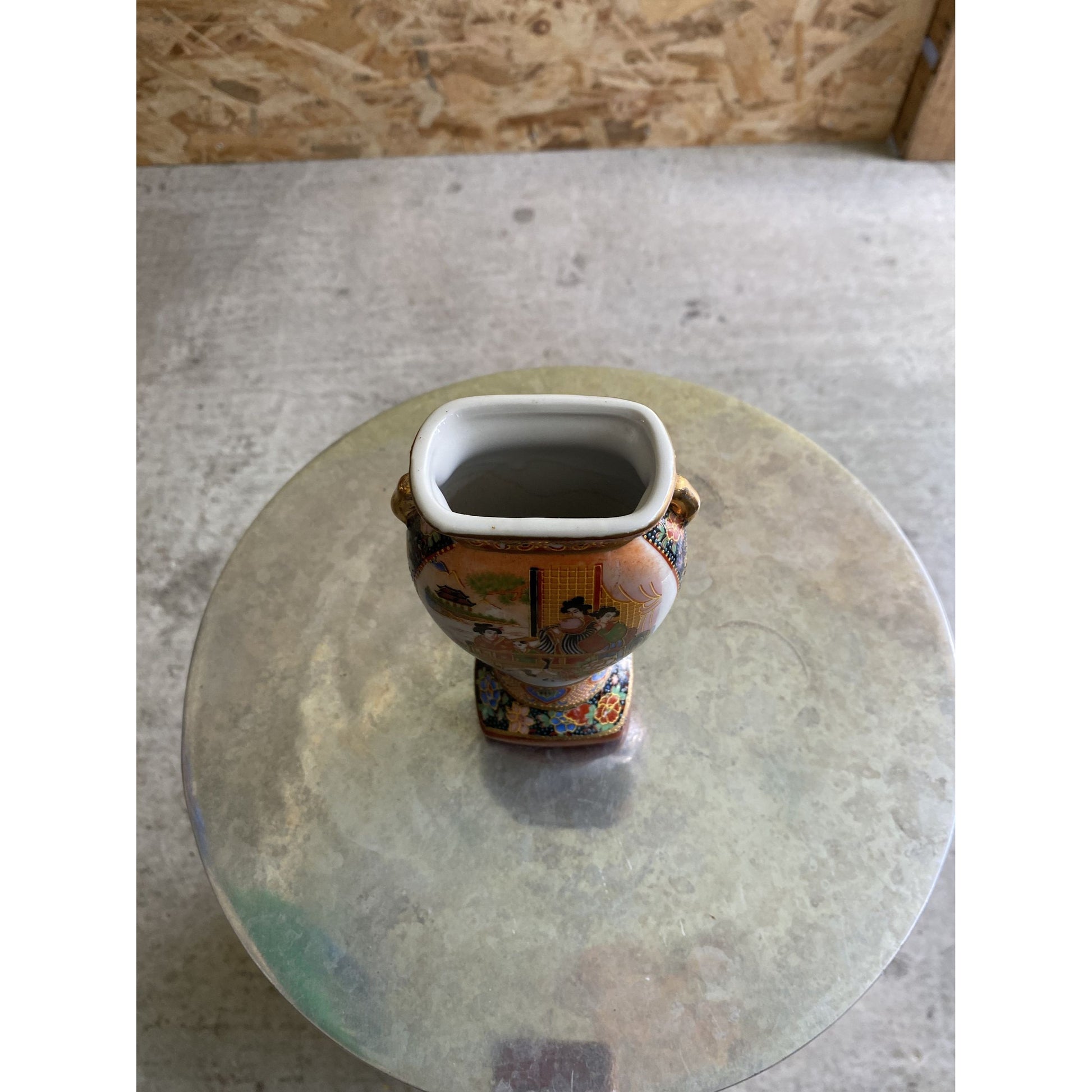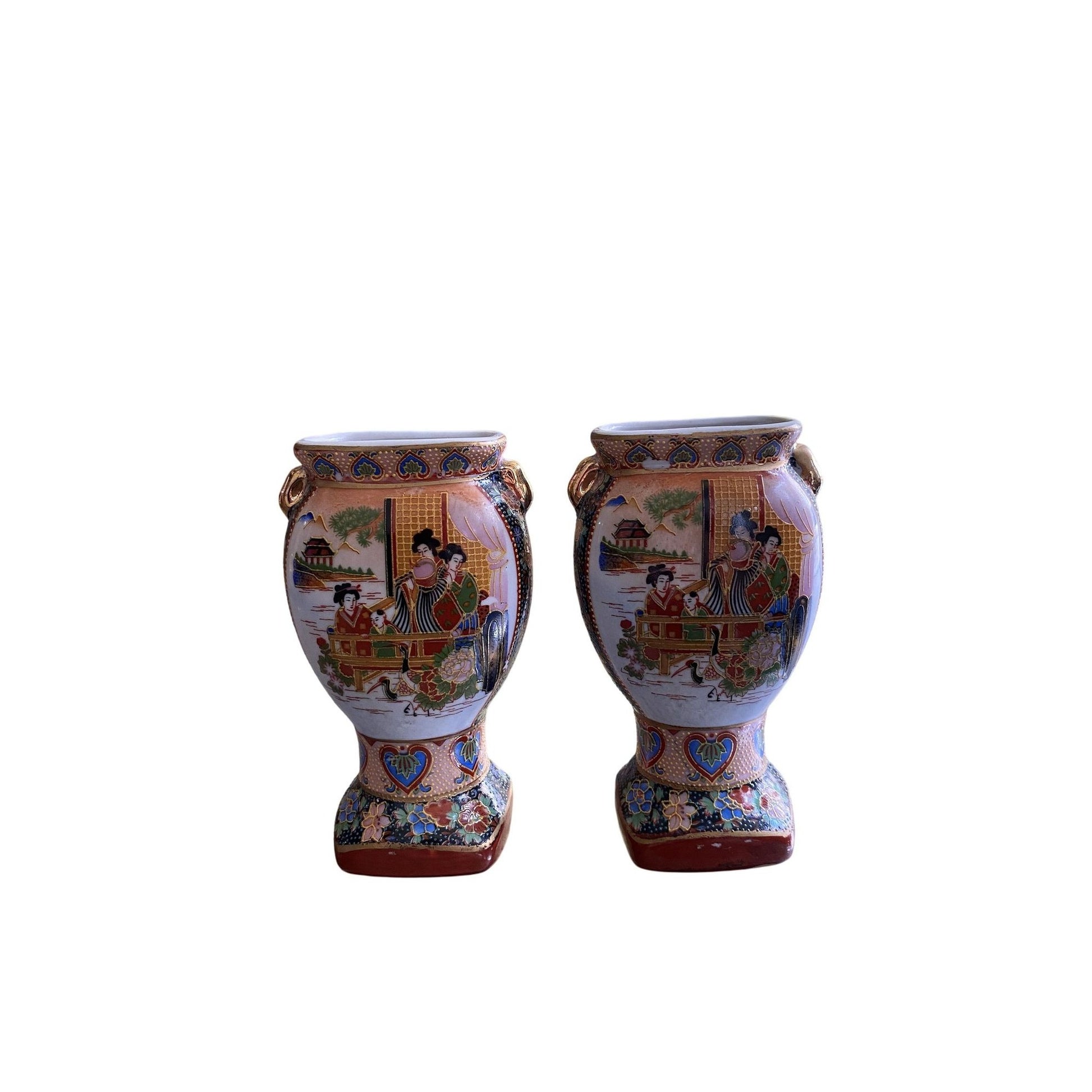 Pair Of Small Japanese Vases With Hand-Painted Design & Handles 14cm Tall