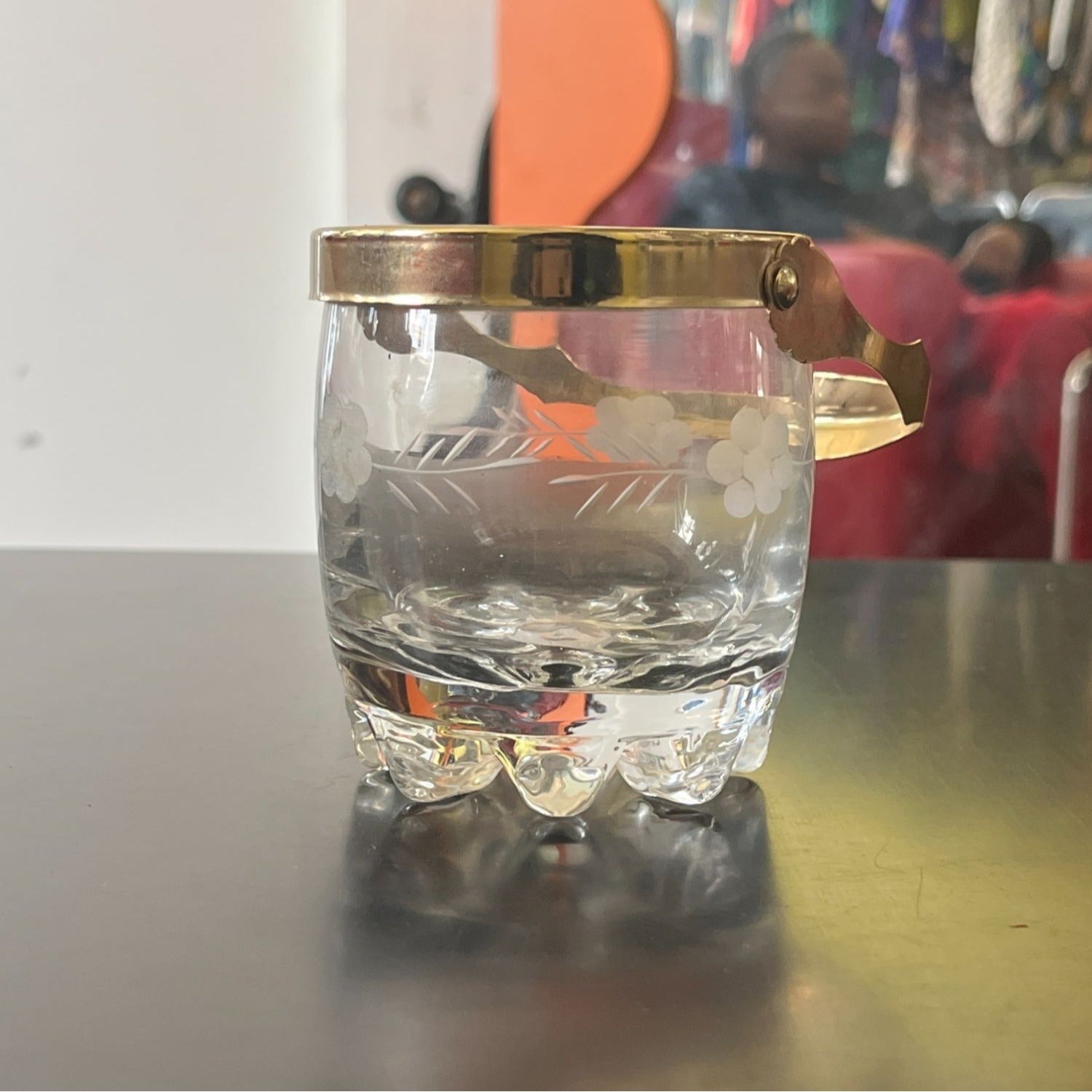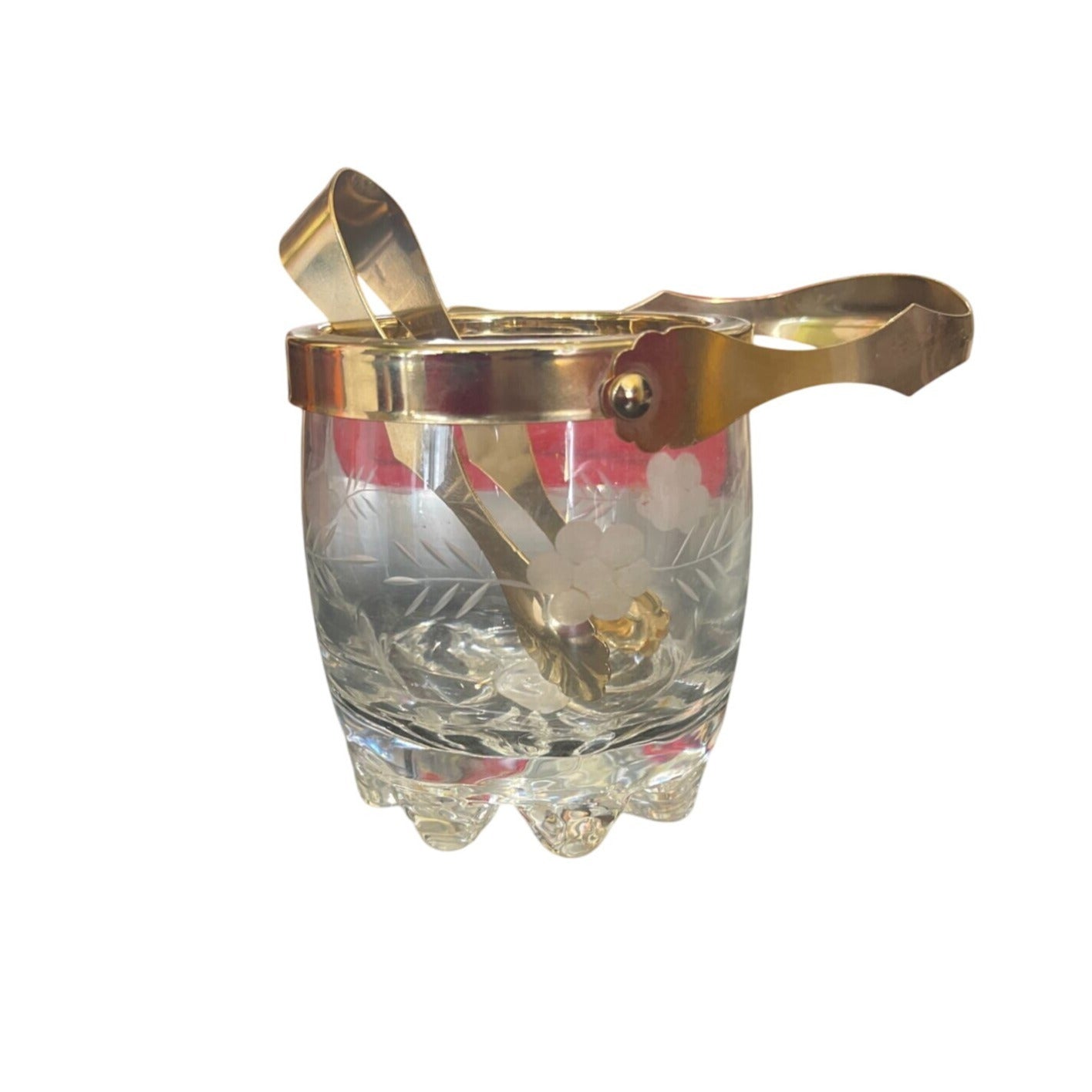 Seau À Glace En Cristal Gravé Avec Pince En Laiton Vintage