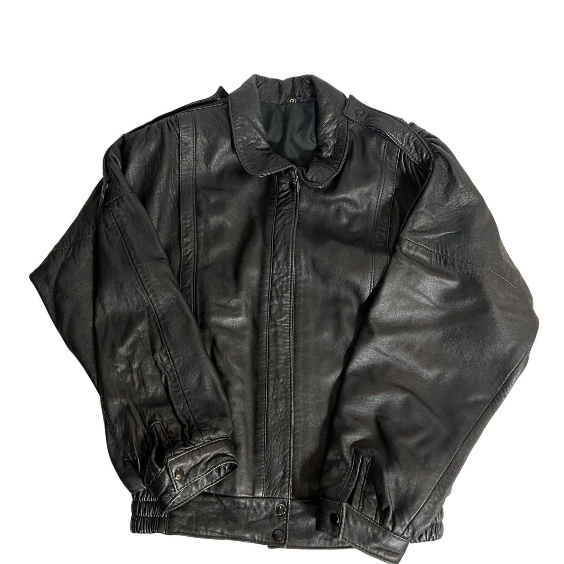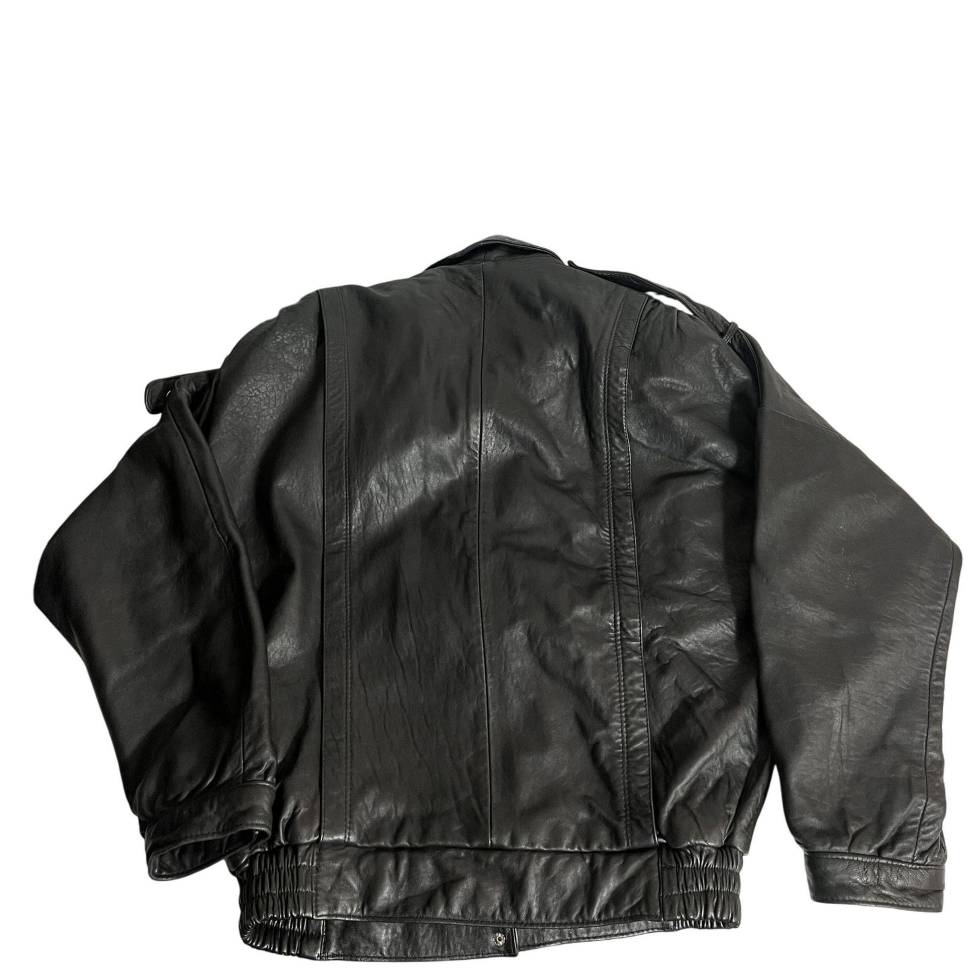 Black Leather Bomber Jacket Large Motorcycle Style Zip Front Mens Outerwear