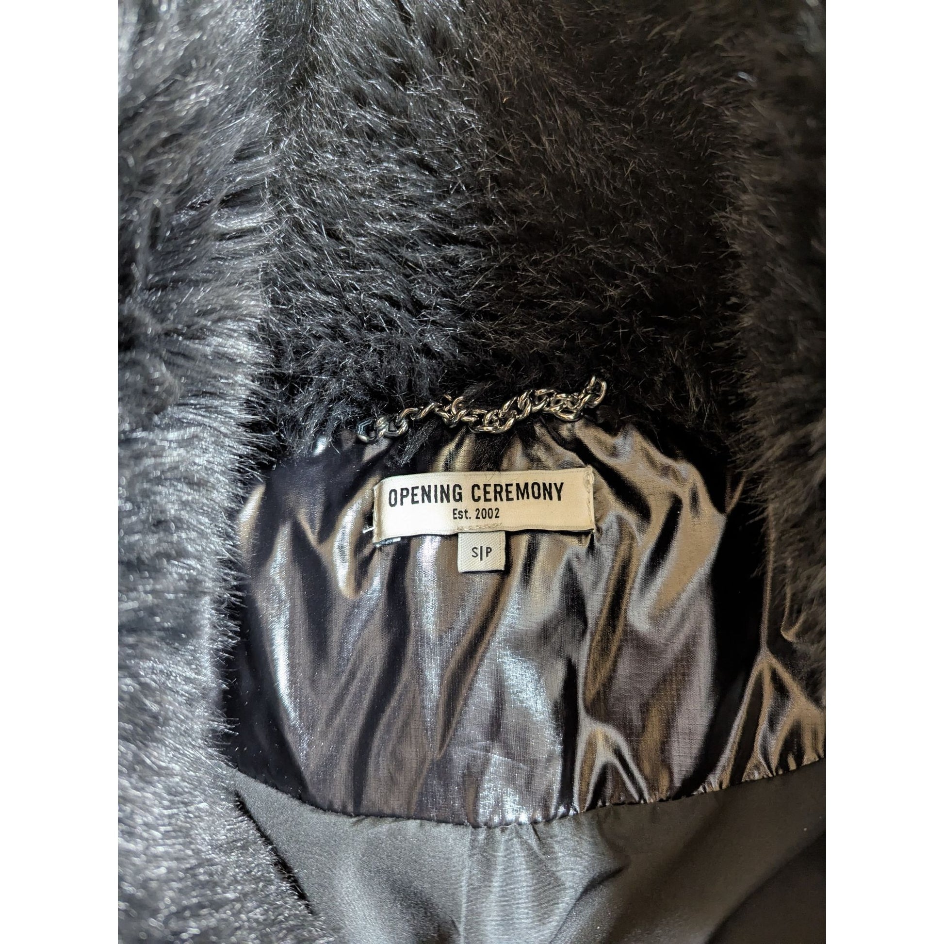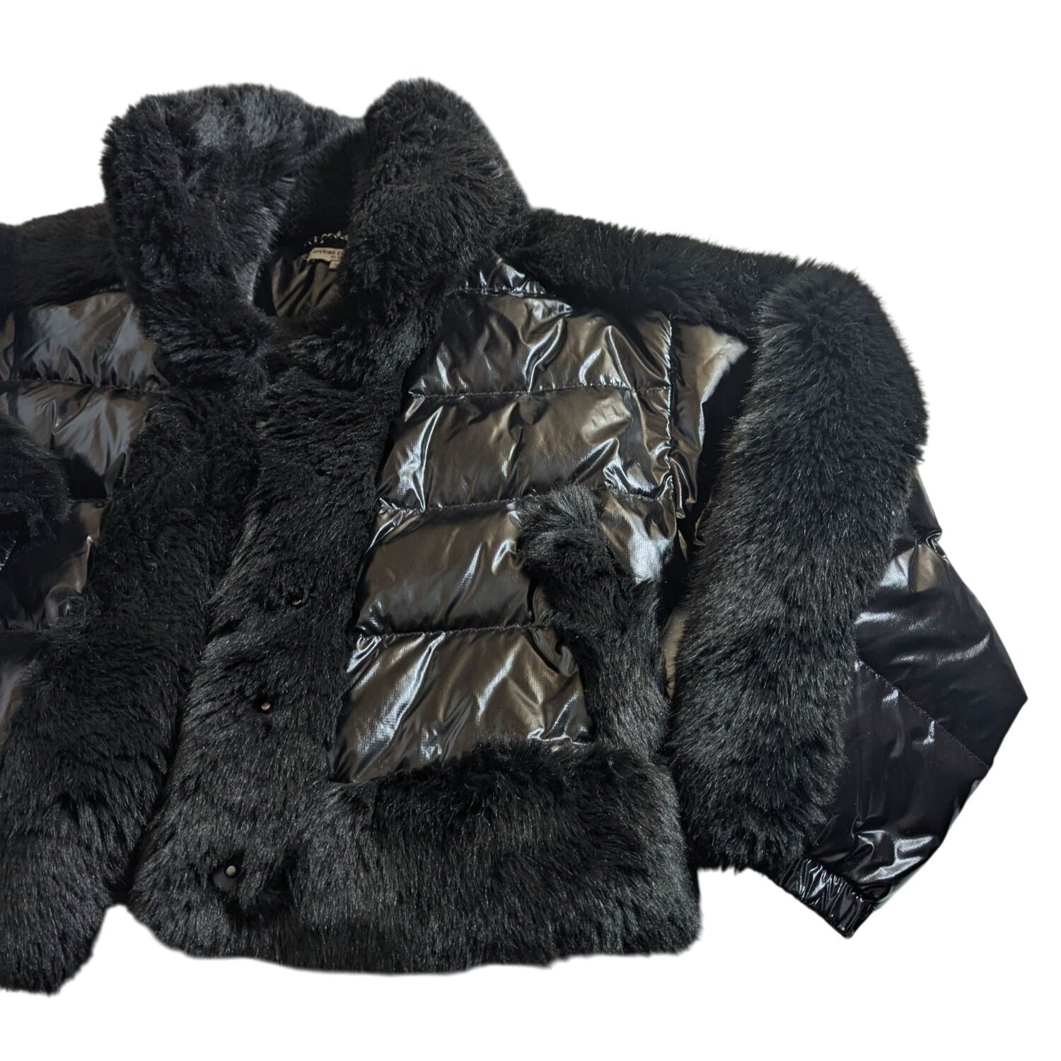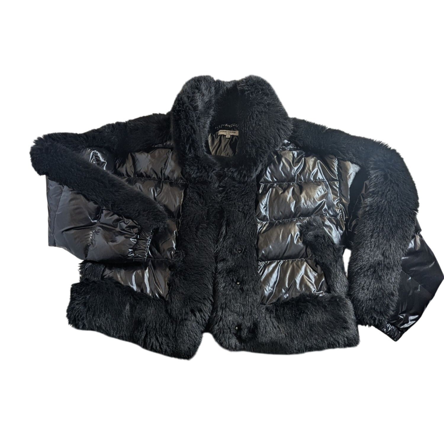 Enveloppez-vous dans l'étreinte luxueuse d'une fausse fourrure noire et de doudounes scintillantes. Cette veste Opening Ceremony allie glamour et chaleur, idéale pour les journées plus fraîches. Sa silhouette courte et chic allie élégance et confort. Une pièce intemporelle à ajouter à votre garde-robe.