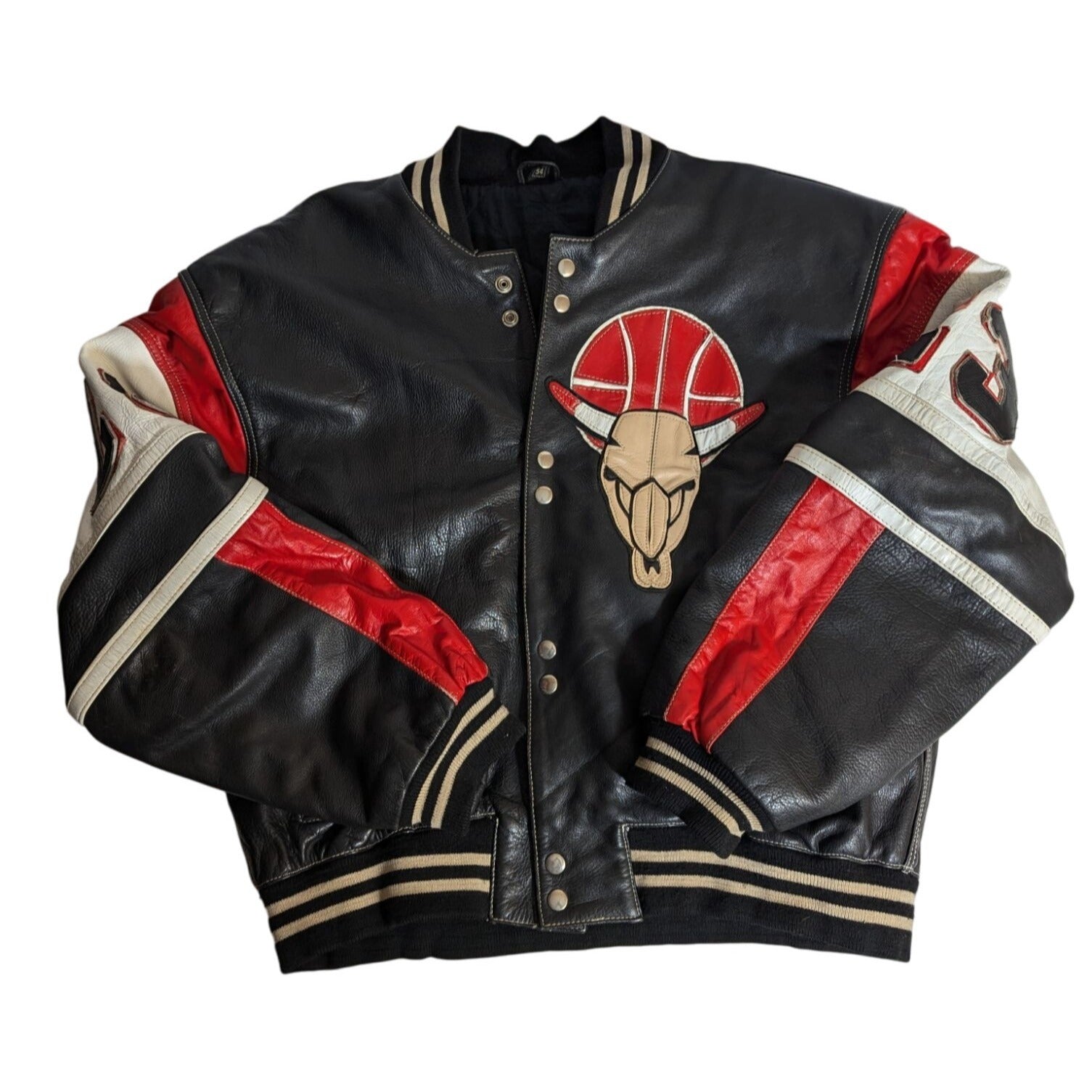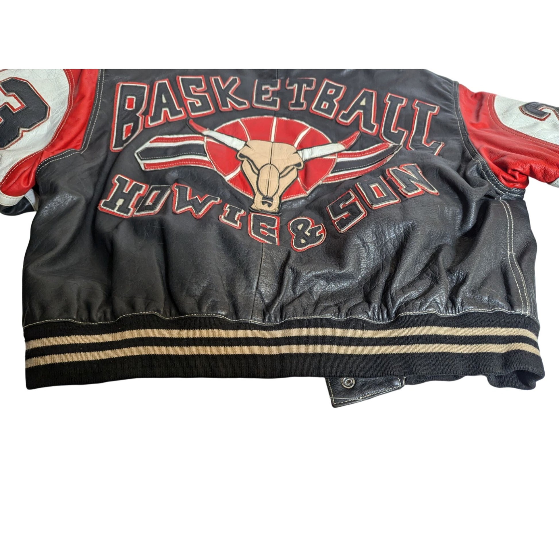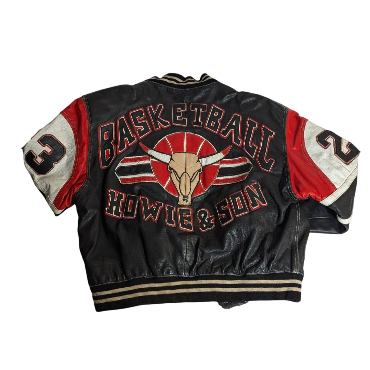 Plongez dans le passé avec cette veste universitaire audacieuse. Confectionnée dans un cuir remarquable, elle évoque la gloire du basketball. Ses teintes rouge et noir éclatantes, sa broderie taureau et son logo Howie & Sons unique évoquent nostalgie et style, ce qui en fait une pièce exceptionnelle pour les collectionneurs comme pour les fans.