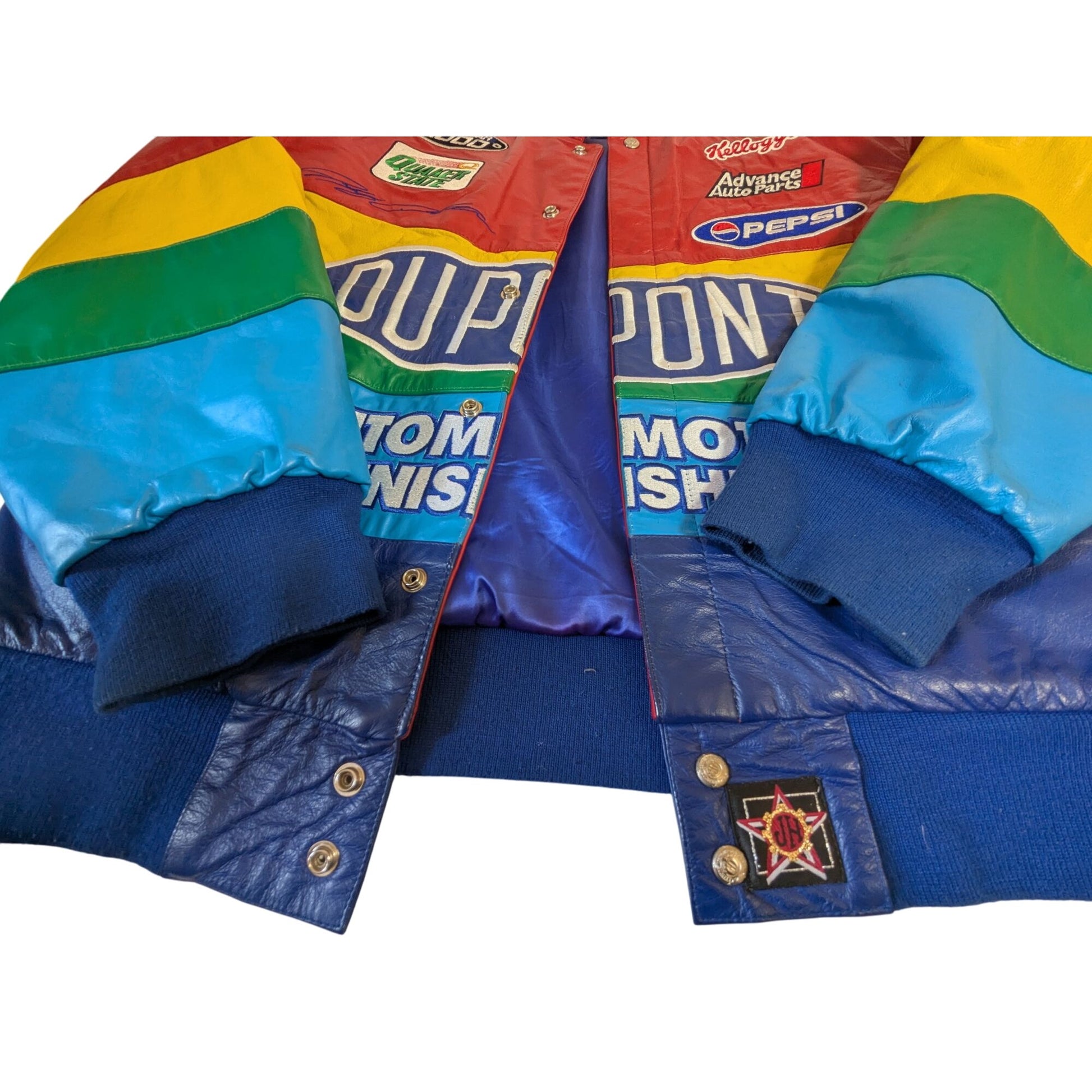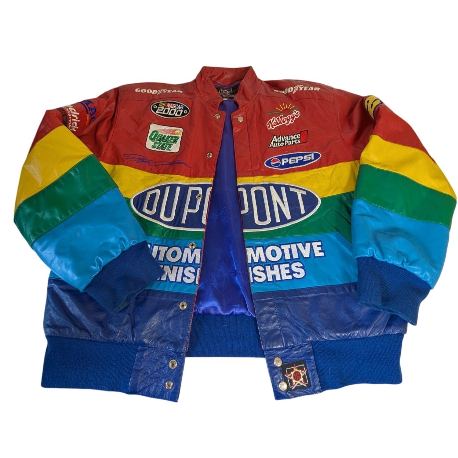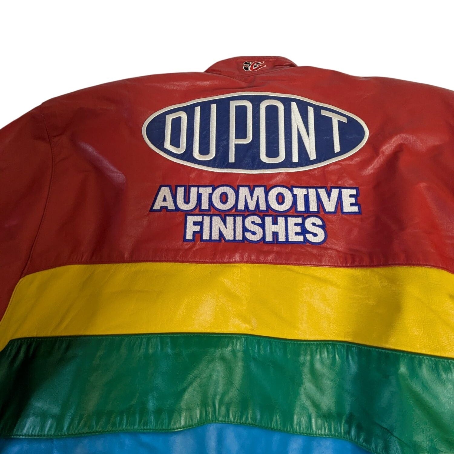 Veste au design multicolore éclatant, ornée des logos Dupont et de la course automobile. Conçue pour les passionnés de NASCAR, elle allie style et esprit d'équipe.
