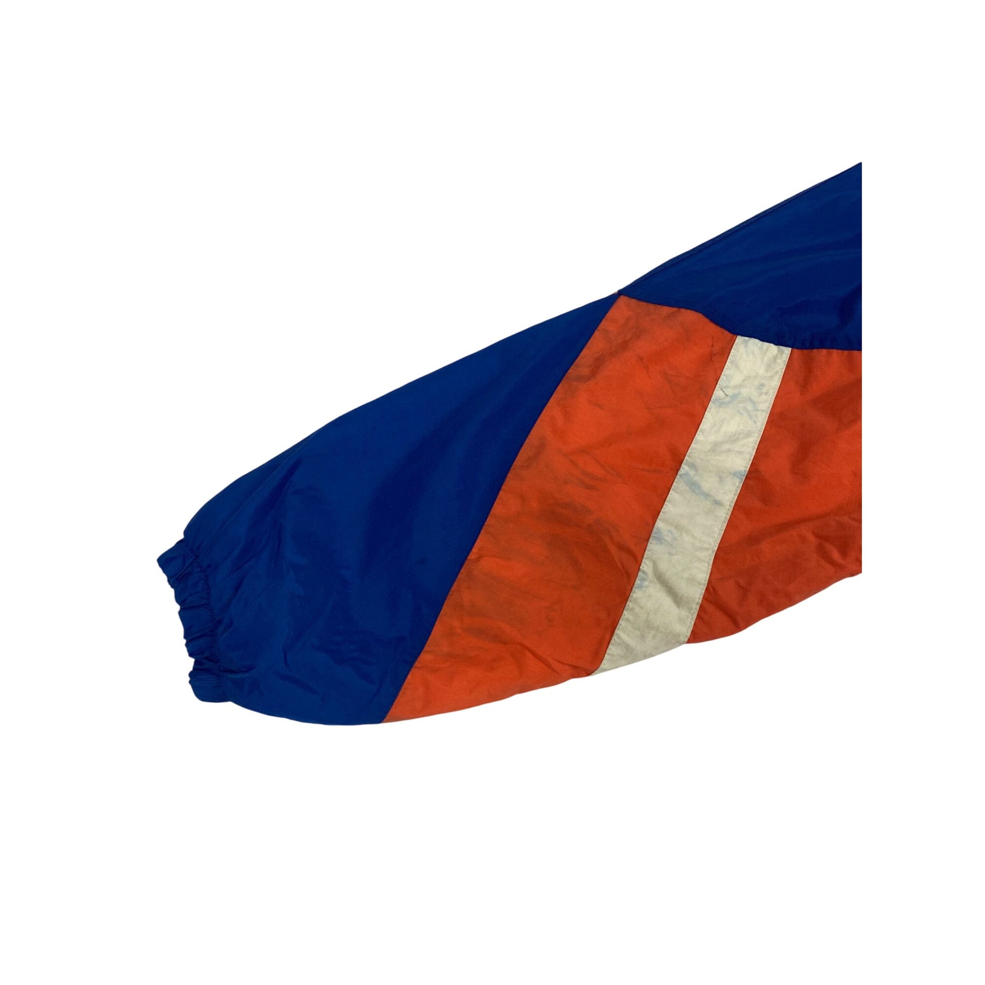 Petite déchirure sur la manche, légère décoloration sur les bandes blanches.
